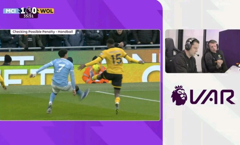He announced to the stadium: “After review, the ball strikes the Wolves player’s arm, which is in a natural position, so the on-field decision stands.”